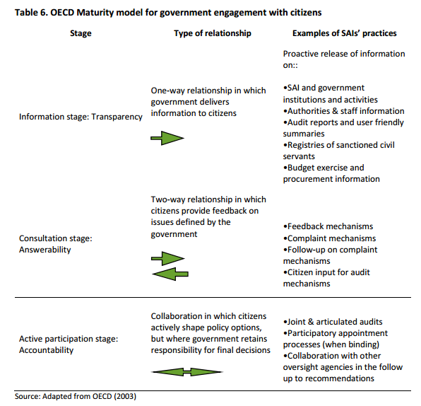 La participación ciudadana en las EFS puede ser incremental, y puede variar desde interacciones unidireccionales a interacciones complementarias de colaboración y comunicación.